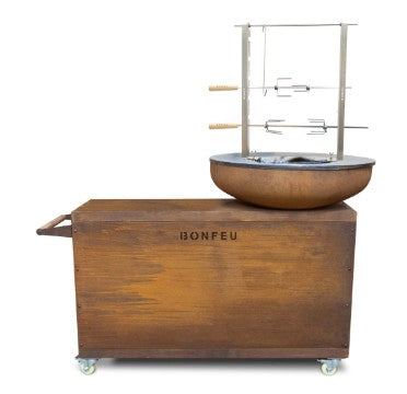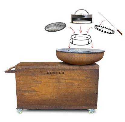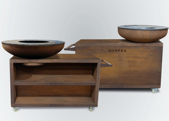 Next to the fire bowl of this mobile outdoor kitchen, there is room for our BonFeu Butcherblock. Under the worktop, you’ll find space for various cooking accessories and extra logs. The stable and beckoning wheels make it easy to place the BonBiza Island wherever you want in your garden. And together with BonFeu’s cooking accessories, the BonBiza Island is a culinary addition to your outdoor space.