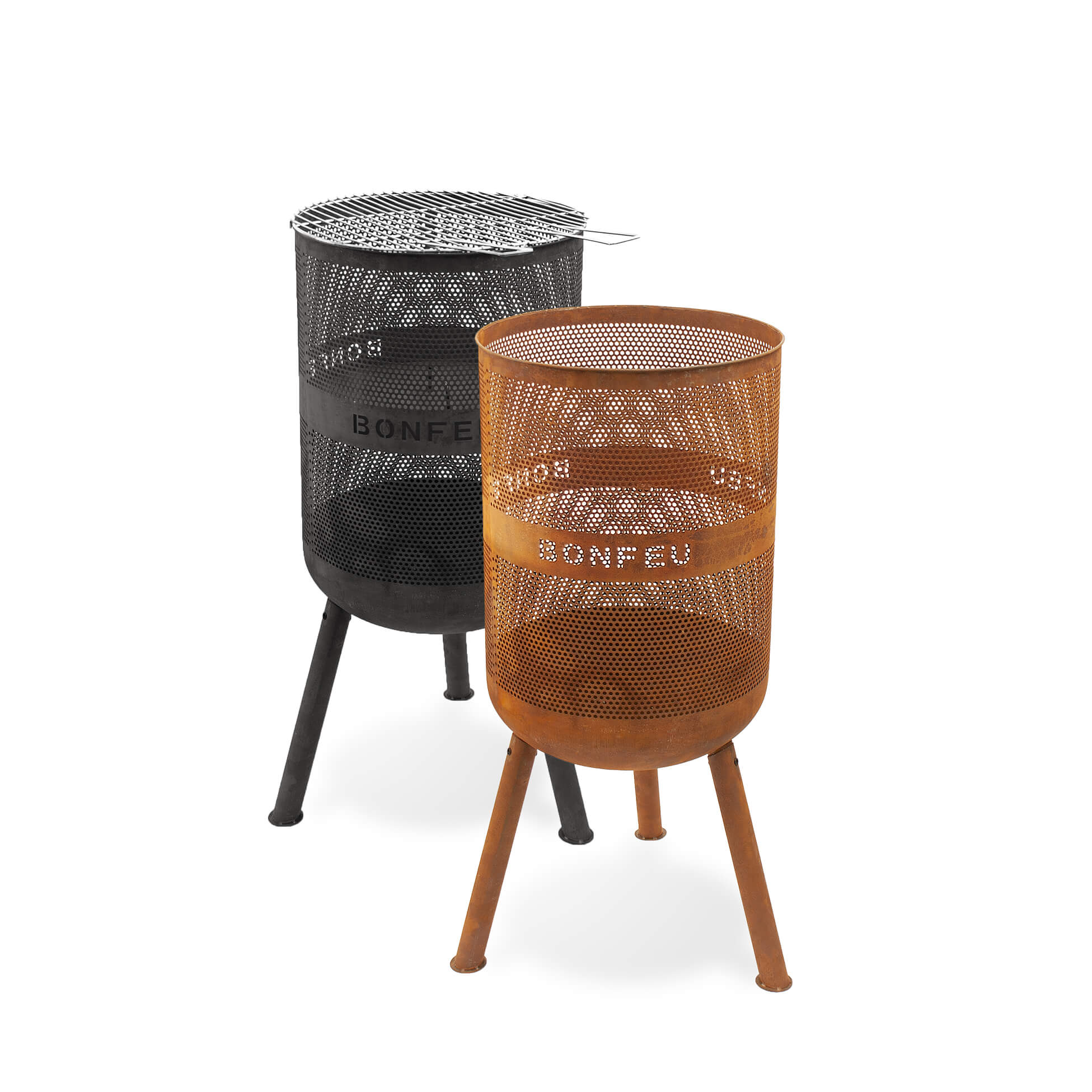 The BonVes is based on an old-fashioned washing machine drum. This type of fire pit, with a perforated drum, is known for its high heat output. In addition, the small holes in the steel have a great atmospheric effect during firing. So you can put on the fire at the bottom of the fire pit, but if you want the fire a little higher up (e.g. for cooking), you can simply hang the provided plateau with a handle at the height you want.